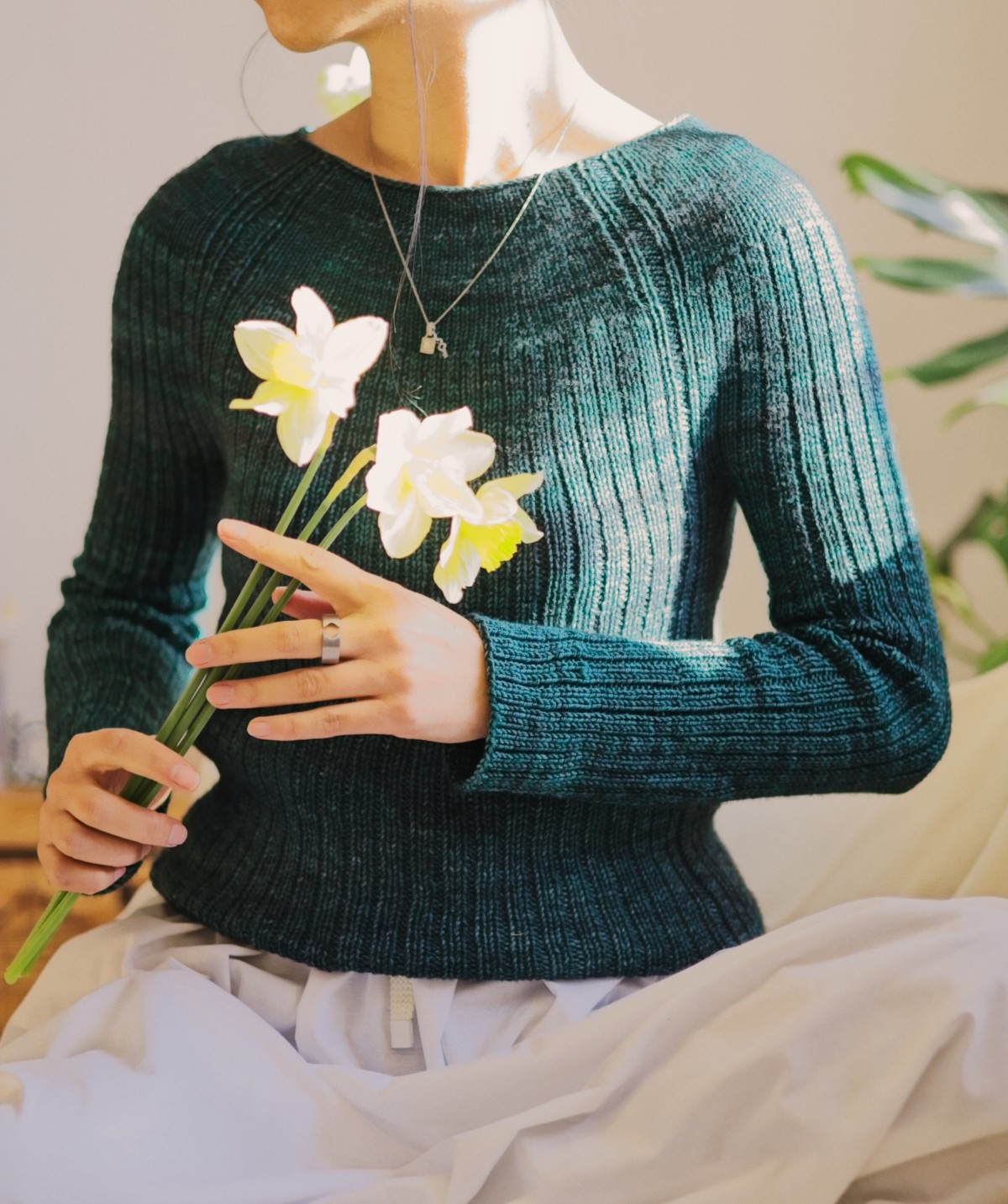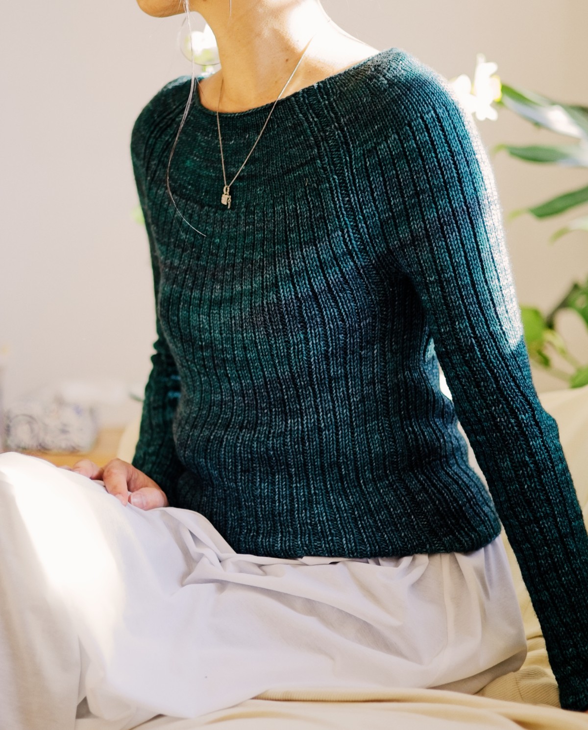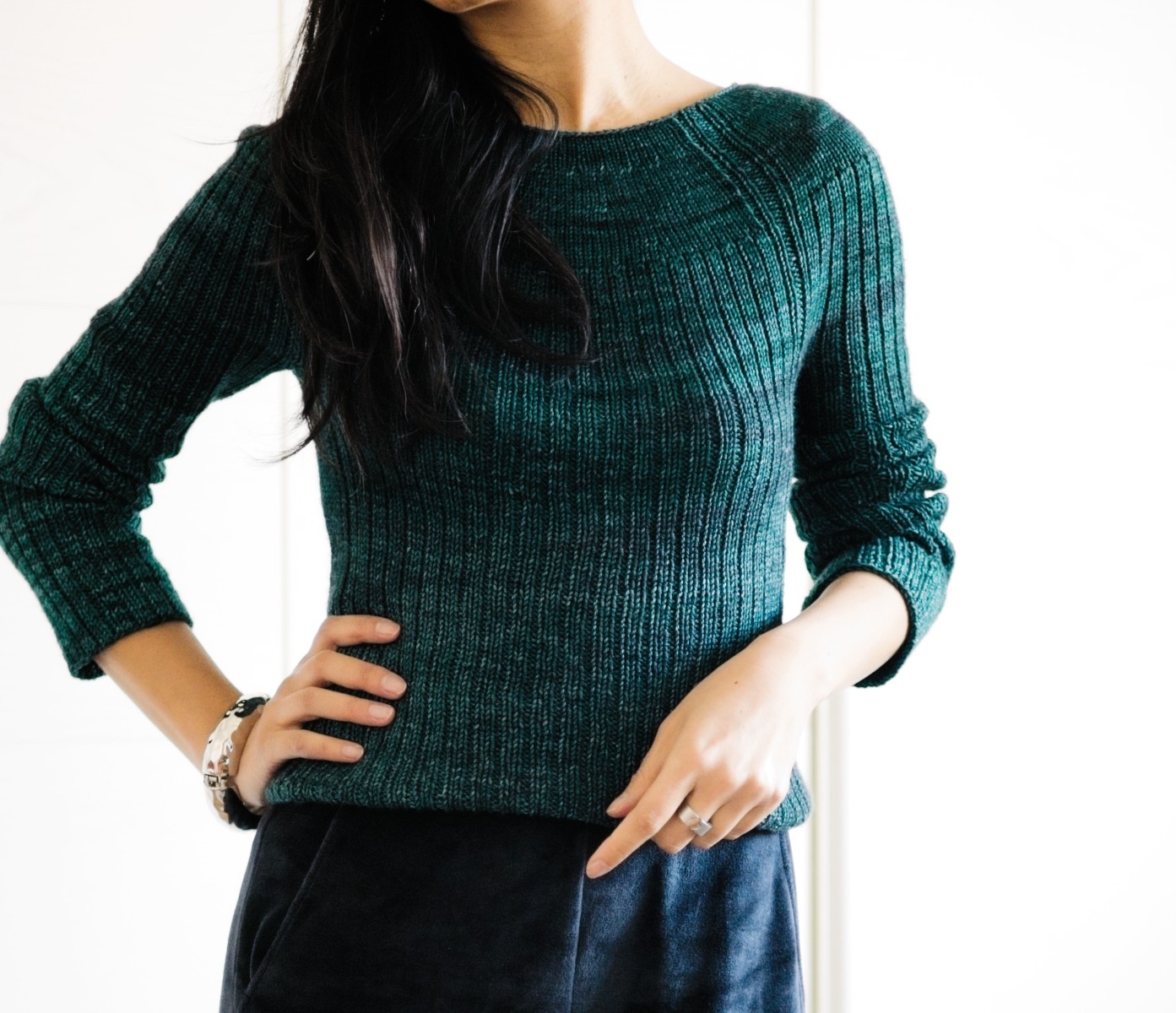 Shown in size 1, modeled with 8.5 cm / 3.25 inches of negative ease.